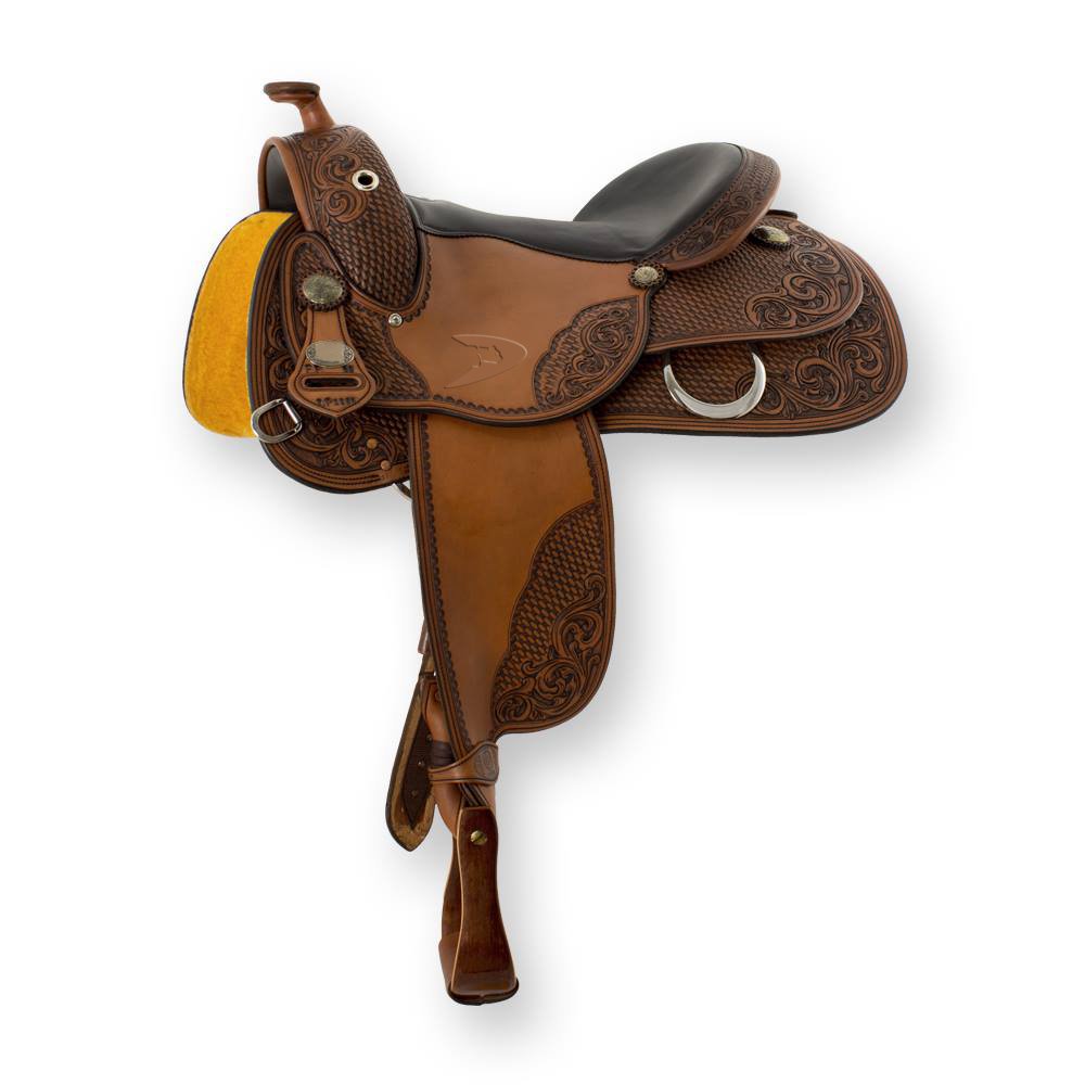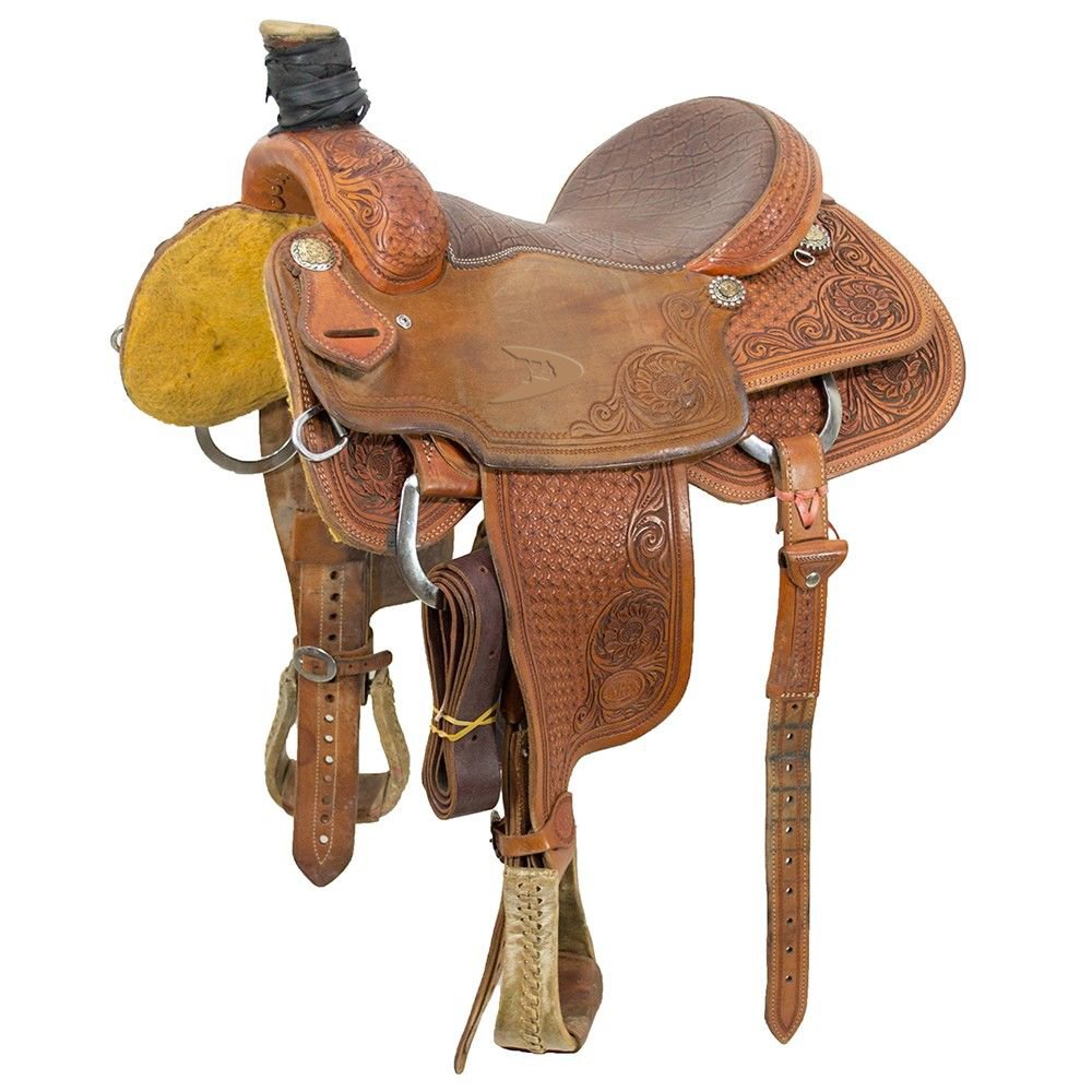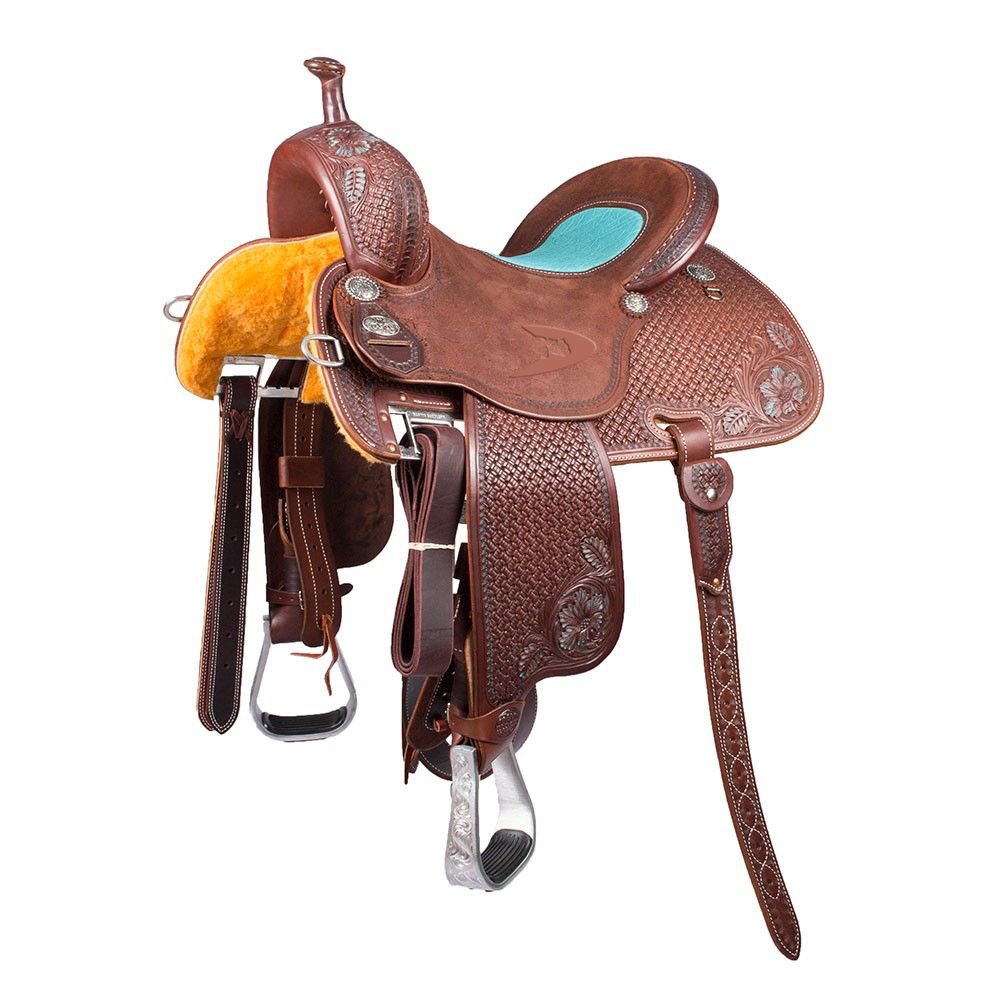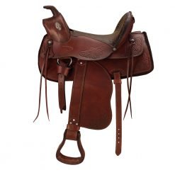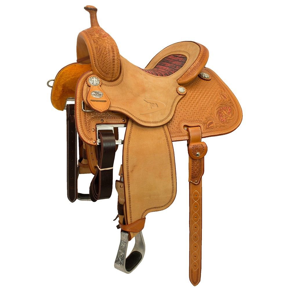 - Hand tooled floral design with fixed girth and stirrups.